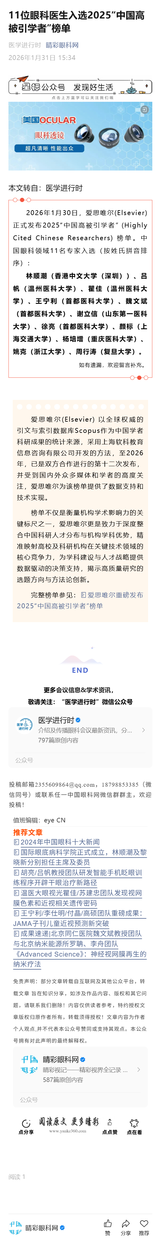 新聞中心 您的當前位置:首頁 > 新聞中心 > 11位眼科醫(yī)生入選2025 11位眼科醫(yī)生入選2025“中國高被引學者”榜單-----2026-1-31 發(fā)布時間:2026-01-31 來源: 作者: